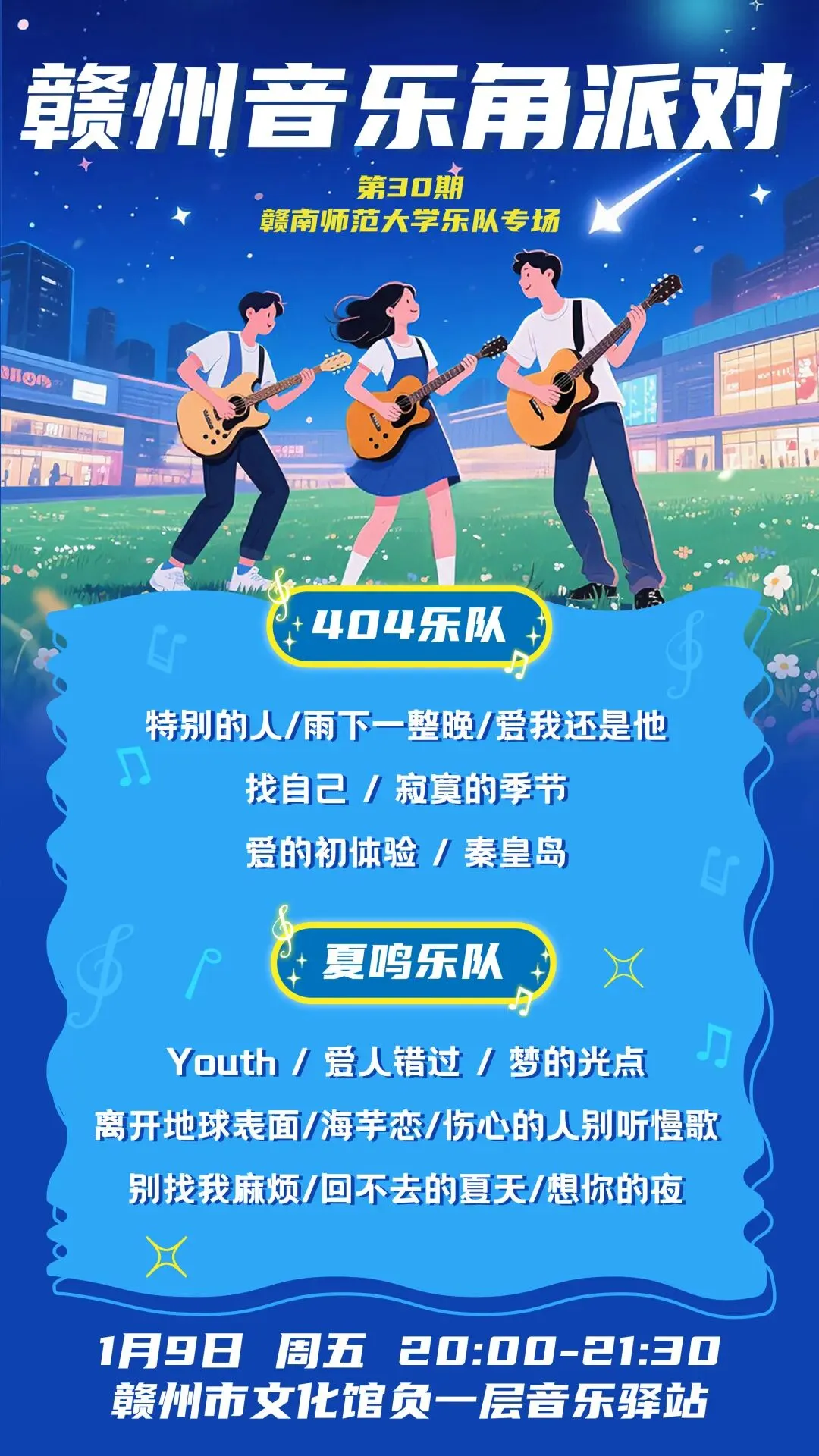 当赣州的冬夜遇上青春旋律,一场值得期待的音乐盛宴即将启幕!赣州市文化馆音乐驿站第三十期活动重磅官宣,此次特邀两支从赣南师范大学走出的实力乐队 —— 404 乐队与夏鸣 Summing 乐队,用专业的演绎与真挚的热爱,为大家带来一场多元曲风的听觉享受。