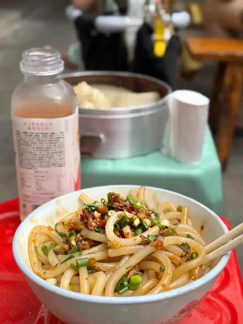 吃的时候得用筷子搅,搅到每根粉条都裹上辣油才算到位。嗦一口进嘴,凉的,辣的,咸的,酸的,一股脑往舌头上撞。嘴巴辣得发麻,脑门开始冒汗,但筷子停不下来。