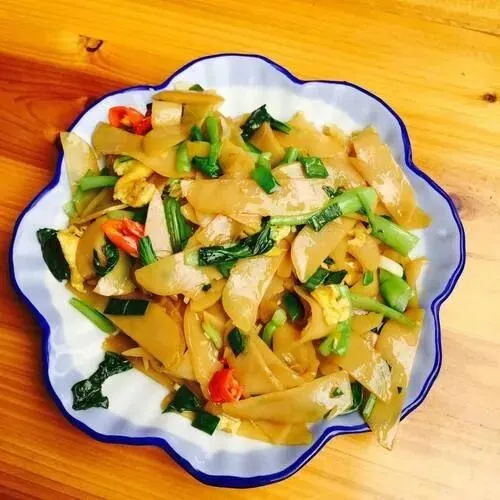 做法讲究,糯米粉加碱水揉成团,蒸熟之后切成薄片。炒的时候下猪油,加蒜苗或者韭菜,大火猛颠。碱水粑本身没啥味道,全靠猪油和锅气往里灌。