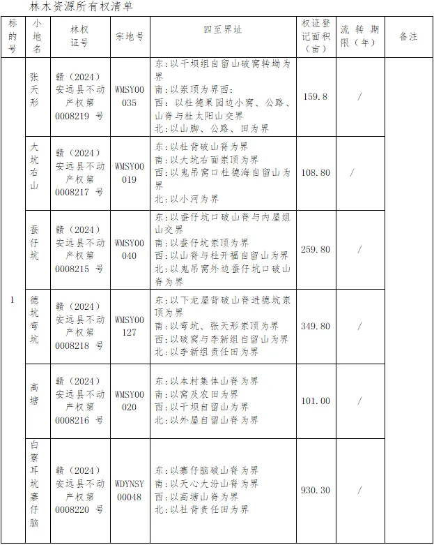 5.林权不动产权证号:赣(2024)安远县不动产权第0008219号、赣(2024)安远县不动产权第0008217号、赣(2024)安远县不动产权第0008215号、赣(2024)安远县不动产权第0008218号、赣(2024)安远县不动产权第 0008216 号和赣(2024)安远县不动产权第0008220号 ;