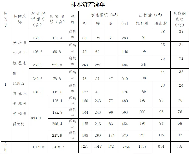 1、本次纳入林木资源所有权流转的资产主要为桉、杉、阔混交林,龄组为成熟林,森林类别为商品林,活立木总蓄积3264立方米,其中杉木蓄积为1275立方米、桉树蓄积为1517立方米(冻灾木)、阔叶树蓄积为472立方米。出材总量为2071立方米,其中规格材1437立方米(杉木规格材为705立方米、桉树规格材为657立方米、阔叶树规格材为75立方米),清山材634立方米;另外采伐剩余物487吨。以上出材总量2071立方米和采伐剩余物487吨均由流入方自行处置。