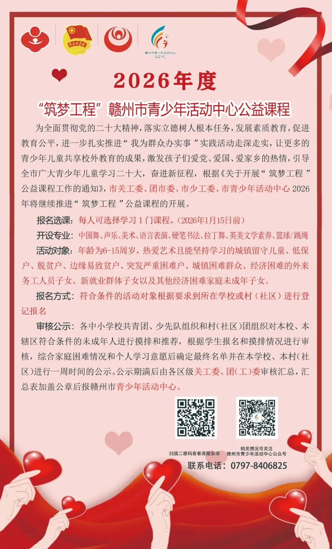 赣州市青少年活动中心是共青团赣州市委下属事业单位,面向青少年儿童开展校外素质教育培训、交流、赛事等;组织开展各类公益活动、社团活动、少先队活动、夏冬令营等综合实践活动及青少年交流活动。活动中心拥有专业的师资和丰富的课程体系,校外培训版块取得中级职称以上教师16人,省级、国家级专业协会成员9名;现开设了舞蹈、器乐、美术、书法、声乐、语言、科技、体育、航模等40多个培训项目,年培训学员1.5万余人次。同时开展全日制学前教育和托育服务。