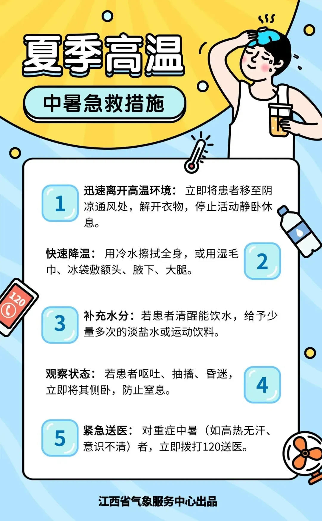 赣州市气象台2025年07月06日09时51分继续发布高温橙色预警信号:预计未来24小时内,章贡区、经开区、蓉江新区、赣县区、南康区、龙南市、全南县、会昌县、安远县、宁都县、上犹县、瑞金市、兴国县、于都县、大余县、信丰县、石城县、崇义县的部分地区最高气温将达37°C以上,其余县的最高气温将达35°C以上,请注意防暑降温和防溺水。