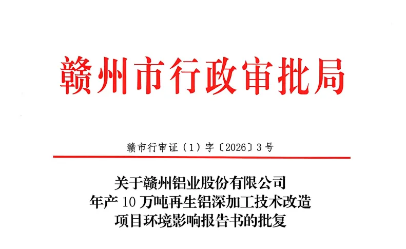 近日,由我司提供技术支持的《赣州铝业股份有限公司年产10万吨再生铝深加工技术改造项目环境影响报告书》顺利获得赣州市行政审批局正式批复(批复文号:赣市行审证(1)字〔2026〕3号),标志着该项目环评审批环节圆满完成,即将进入建设实施阶段。