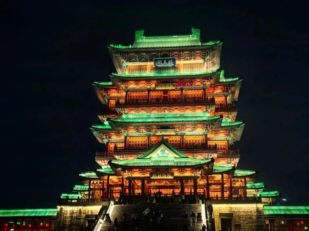 滕王阁坐落在赣江边,总楼高九层,最底下两层是雄伟宏大、画栋雕龙的须弥台,台上用卯榫筑成了7层纯木结构的楼阁。虽才9层建筑,与周边建筑对比并没有高度优势,但其独特的造型,皇家阁楼的气派显得其如人中龙凤,特别耀眼。时值夜灯初上,楼体已经灯火辉煌、流光溢彩、光彩夺目。楼阁前广场正在举行“寻梦滕王阁”的演出,只见万千唐朝舞者缓歌慢舞霓裳羽衣,和着滕王阁上变幻的五彩灯光,恍惚一秒跨千年,梦回当年盛世大唐。