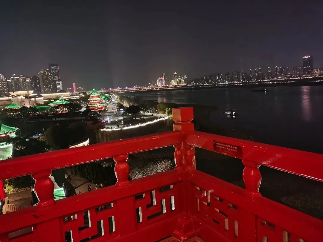 阁中3楼和5楼均有回廊阳台供游客绕阁一周外观周边景色,烟波飘渺的赣江就在脚底下,虽未见王勃所说的“落霞与孤鹜,闾阎与舸舰”,但南昌城的人间烟火和万家灯火也不逊色。倚着栏杆仰望,一轮红色的圆月正挂在遥远的夜幕长空。诗人常说“今人不见古时月,今月曾经照古人”,也许这轮明月也见证着当年的那场盛事吧。