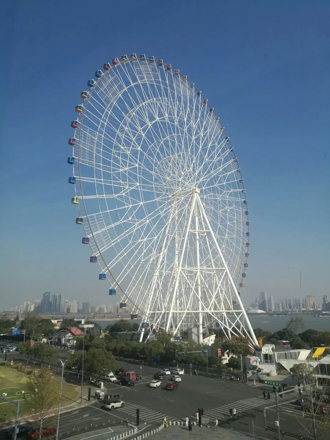 继续沿着江边往南走,便来到小孩心心念念的南昌之星---中国最高的摩天轮。整个巨大的圆盘悬挂在赣江边----与对岸的滕王阁遥遥相望,最高处直入云霄。摩天轮上的一个个轿厢缓缓转动,犹如时间的年轮慢慢行走。摩天轮没有一个小孩不喜欢,坐在轿厢里的他们更不安分,左摇右晃、前仰后合。在百米高空往下望,路上的汽车也如蚂蚁搬在行走,摇晃的轿厢如腾空在云中的电梯,我手心出汗,强做镇定,眺望远处求一时淡定。