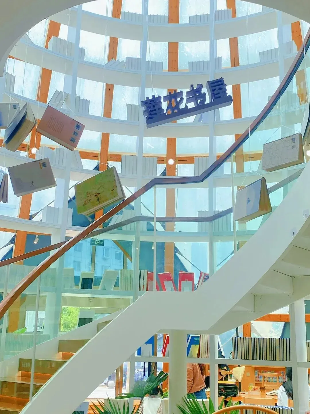 莲花书屋静立于城市一隅,以含苞待放的莲花之姿悄然绽放。挑高的穹顶覆着朦胧的玻璃,阳光漫洒而入,光影在书页间温柔流动。螺旋楼梯蜿蜒连接两层空间,绿意点缀其间,露营伞下、书桌旁,处处是随意松弛的阅读角落。