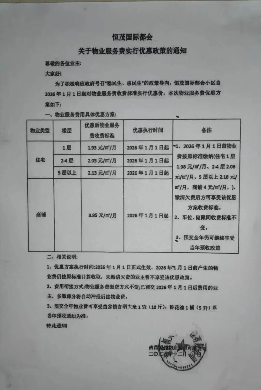 “降价1毛都算多的,我们小区才降5分钱!”青山湖区恒茂国际都会小区的业主看到报道后,第一时间联系栏目记者,吐槽自家小区的情况。据该业主介绍,小区物业公司恒兴物业管理有限公司近期发文,将物业费标准同比下调5分钱。这样的降幅,业主们直言:“真是气到笑!”