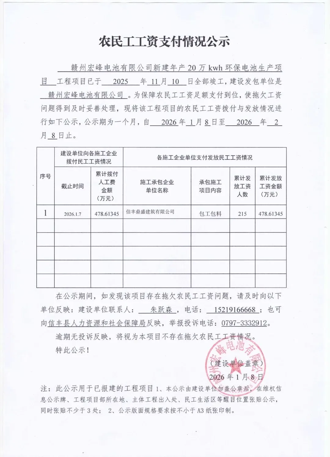 赣州宏峰电池有限公司新建年产20万Kwh环保电池生产项目农民工工资支付情况公示