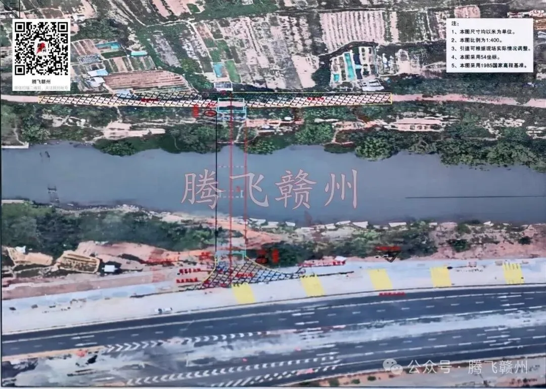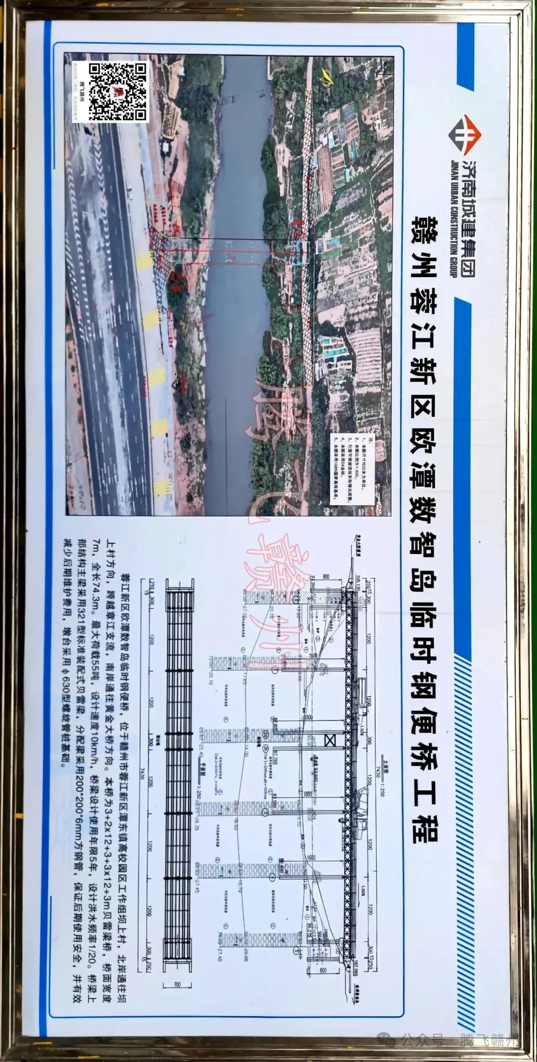蓉江新区欧潭数智岛临时钢便桥,位于赣州市蓉江新区潭东镇高校园区工作组坝上村,北岸通往坝上村方向,跨越章江支流,南岸通往黄金大桥方向。