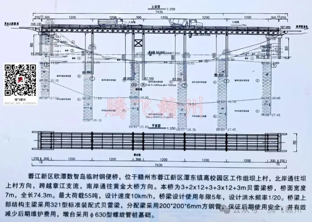 本桥为3+2x12+3+3x12+3m贝雷梁桥,桥面宽度7m,全长74.3m。最大荷载55吨,设计速度10km/h,桥梁设计使用年限5年,设计洪水频率1/20。桥梁上部结构主梁采用321型标准装配式贝雷梁,分配梁采用200*200*6mm方钢管,保证后期使用安全,并有效减少后期维护费用,墩台采用中630型螺旋管桩基础。
