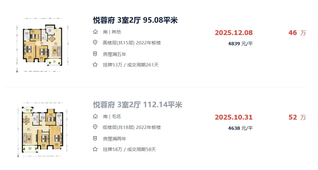 例如悦蓉府小区,在2024年以前,普遍还能卖到六千至九千多每平,2025年成交4套,成交单价在四千至六千多每平,价格明显下滑。2025年10月底成交的这套房源,为建筑面积约112.14㎡三房两厅,位于低楼层(共18层),室内为毛坯,成交总价52万元 ,成交单价4638元/㎡,成交周期58天,算是比较快成交的房源了。最新成交的这套,为建筑面积约95.08㎡三房两厅,位于高楼层(共15层),室内为其他,成交总价在46万元,单价4839元/㎡,成交周期261天。再来看看新房当时销售价格,悦蓉府于2019年6月26日首开,均价在7800元/㎡,当时楼市行情较好,利率较高,加上税费、利息等,总价算下来并不便宜。悦蓉府于2022年3月底交房,到至今已有近4年时间,算是次新小区,小区环境、配套设施、外立面等较好,户型设计也没什么太大问题,都是市面上比较常见的三四房户型。最后,你觉得悦蓉府小区怎么样?单价4字头值得购买吗?欢迎评论区留言讨论!
