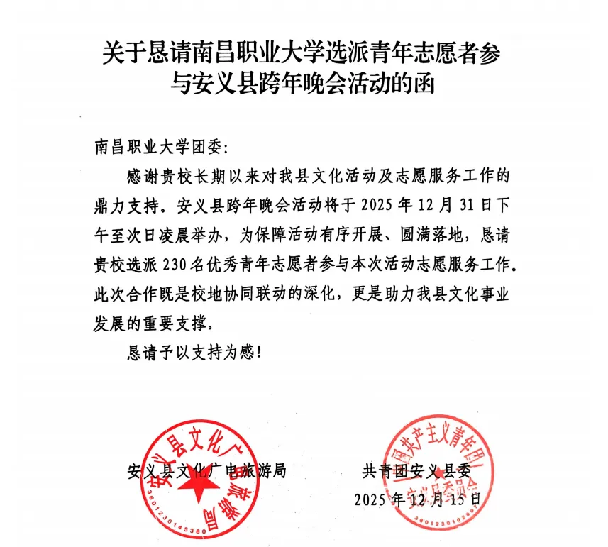 南昌职业大学积极响应号召,从信息技术学院、工程技术学院、经济管理学院共选派234名优秀青年志愿者,协助安义县文化广电旅游局、共青团安义县委开展活动保障工作,以专业服务与青春热情为跨年夜保驾护航,彰显了南职大学子的责任与担当。