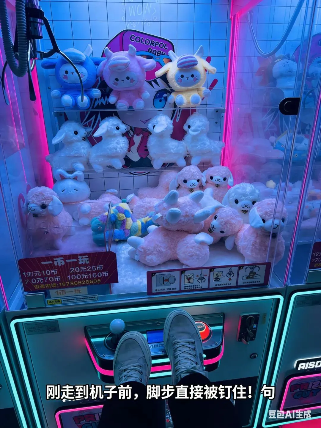 刚走到机子前,我的脚步就被牢牢钉住了。第一眼就被满柜的粉色羊驼玩偶暴击,蓬松的绒毛、圆溜溜的眼睛,搭配蓝粉撞色的霓虹灯光,拍照都不用加滤镜,随手一拍都是氛围感大片。旁边的Mini BabyⅡ娃娃机更过分,星黛露、草莓熊、布丁狗扎堆,各种萌系公仔挤在一起,简直是二次元和少女心的双重暴击。