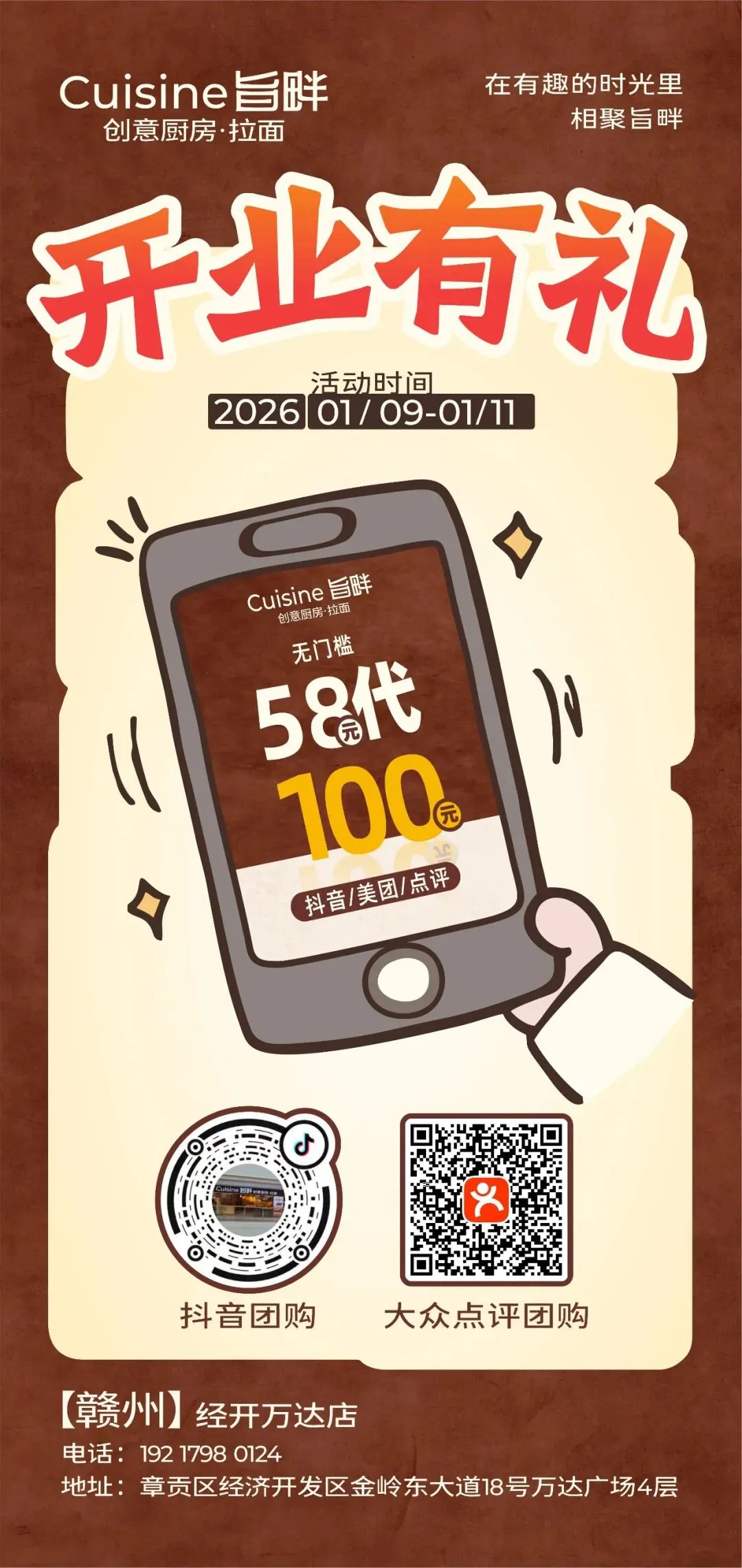 赣州吃货冲!「旨畔创意厨房」盛大开业,58抵100全场通用,福利群还有隐藏惊喜~
