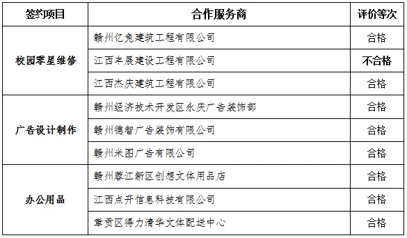 我校于2024年12月公开遴选中选的校园零星维修、广告设计制作、办公用品采购服务商,根据原定“1+1+1”签约模式,目前进行了年度工作服务评价,对工作评价不合格的服务商终止合作关系,同时进行遴选增补工作。现将年度工作服务评价情况公告如下: