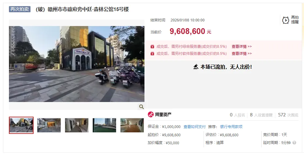 在刚刚结束的第5次拍卖,起拍价为960.86万元,对比前几次还上调了,结果依旧无人出价流拍。