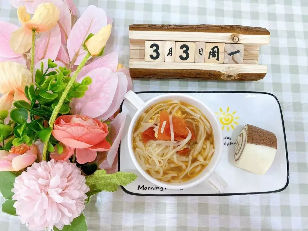 香菇青菜瘦肉粉、蒸红薯、水煮鸡蛋