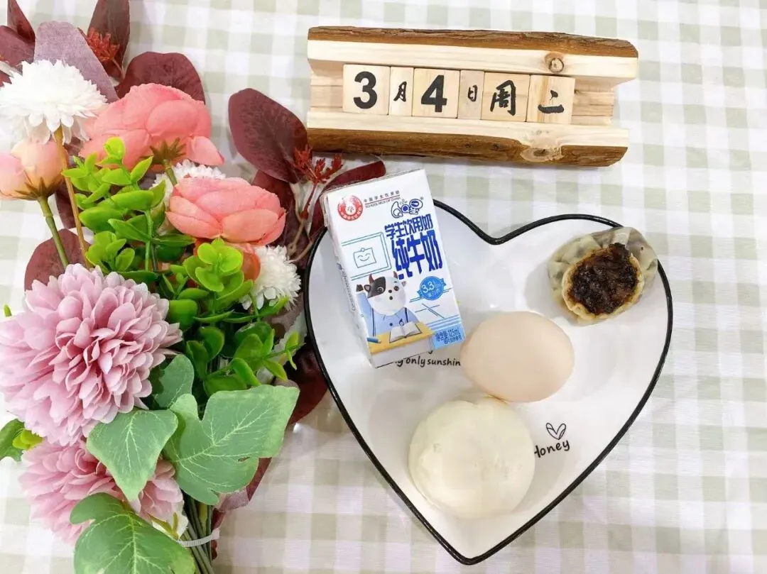 牛奶、紫米烧麦、豆沙包、盐水鸡蛋