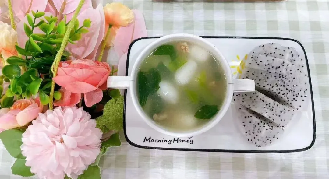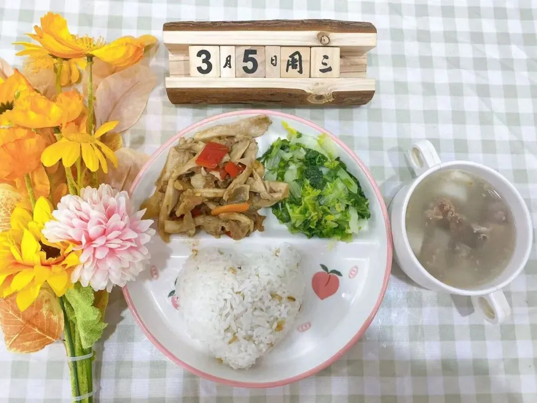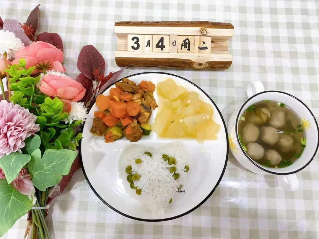 青豆饭、虾皮紫菜肉丸汤、宫爆鸡丁、素炒冬瓜