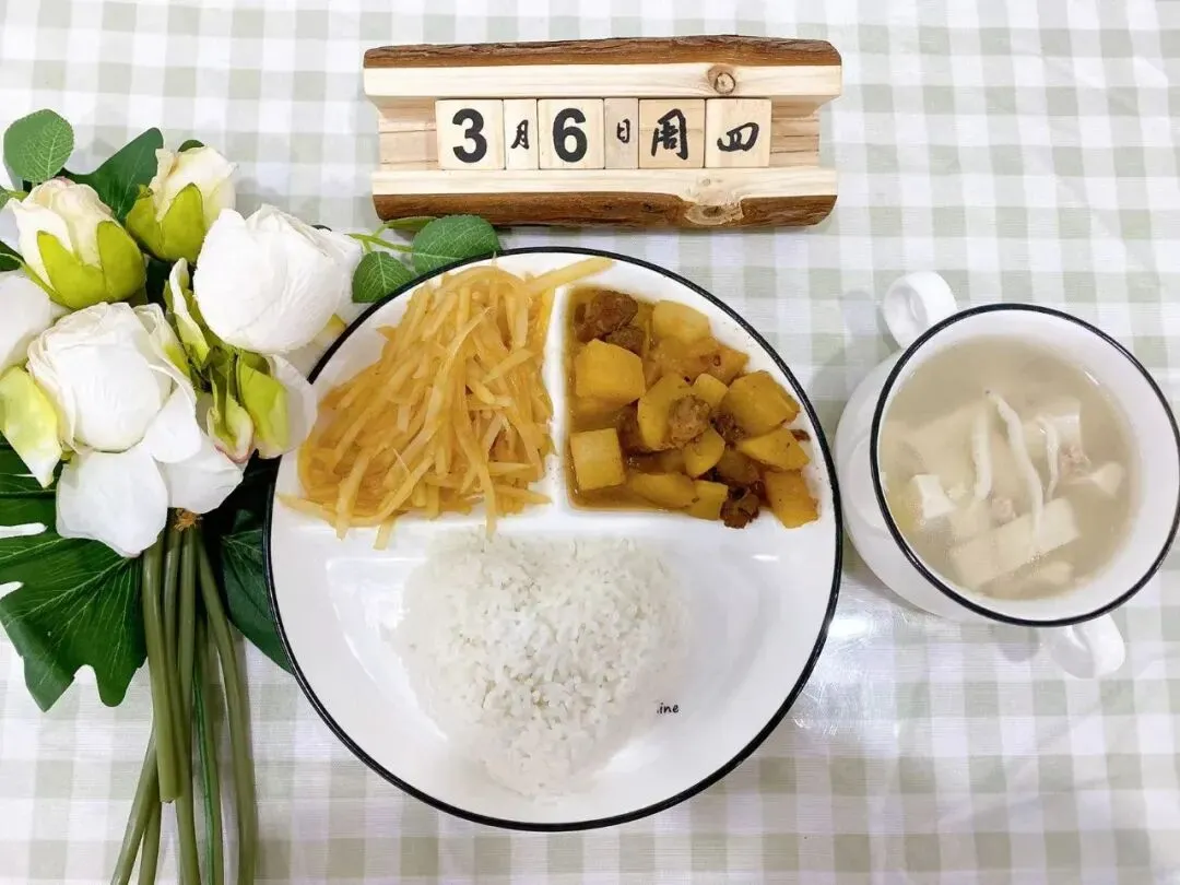 白米饭、银鱼豆腐汤、白萝卜焖鸭、醋溜土豆丝