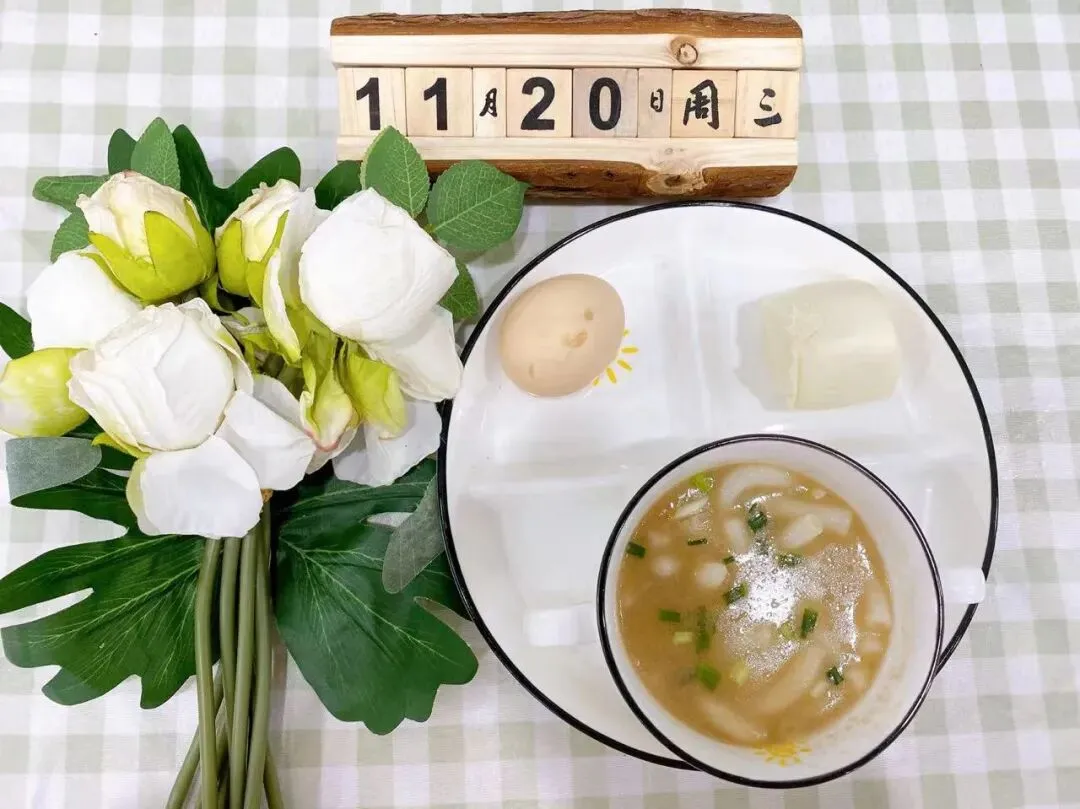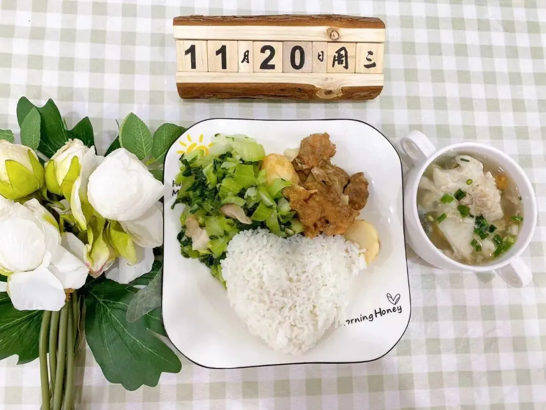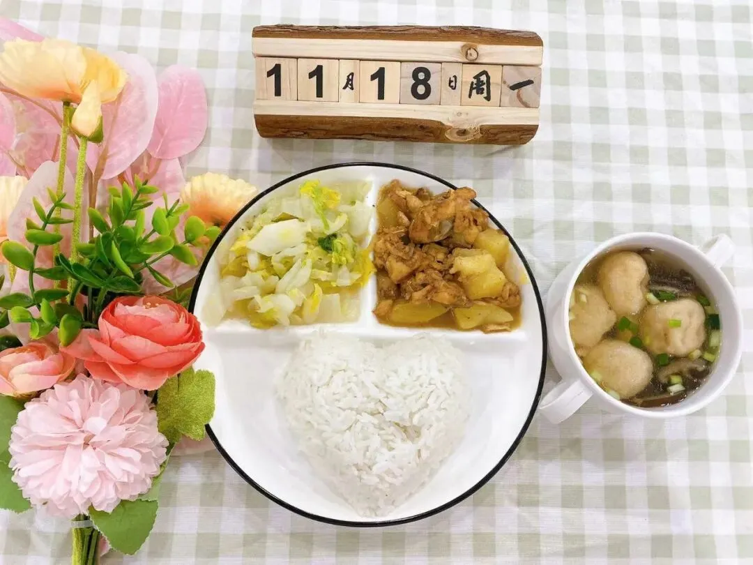 午 餐:香菇鱼饼汤、土豆炖鸡、蒜蓉大白菜
