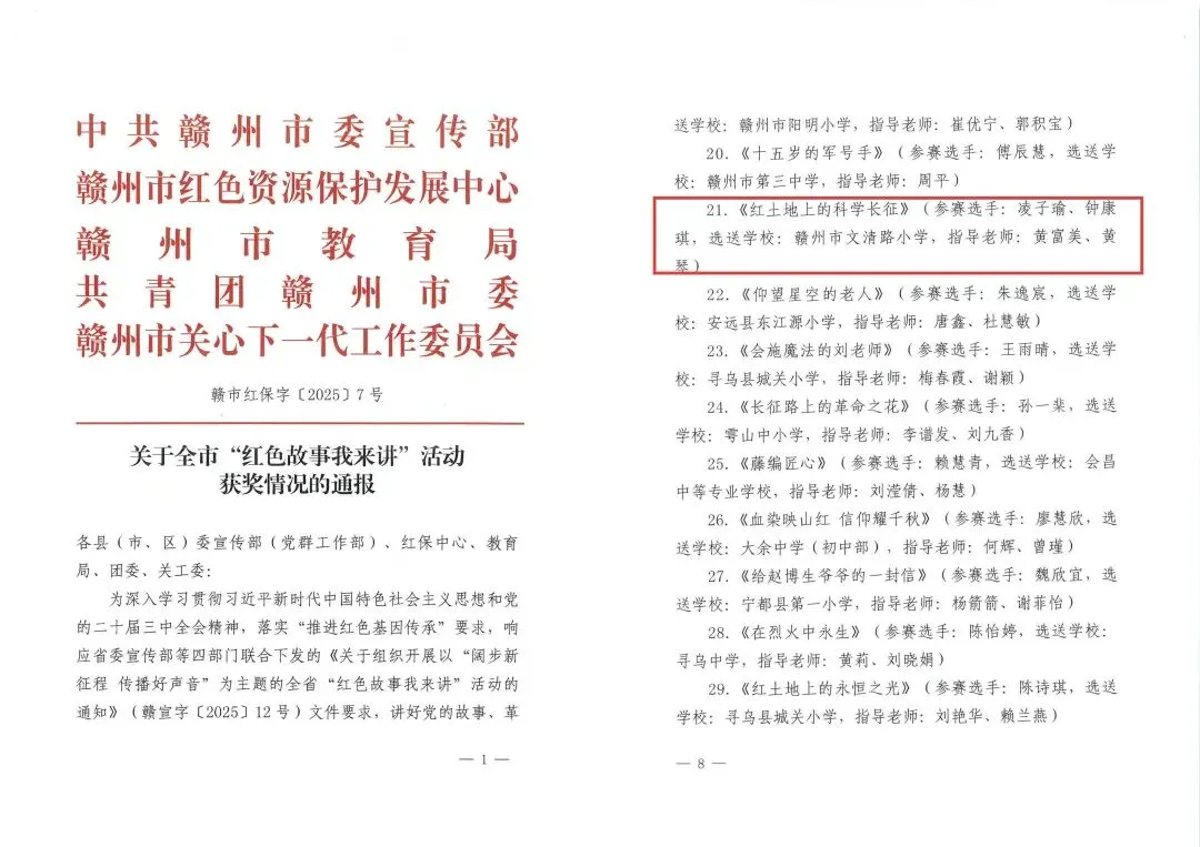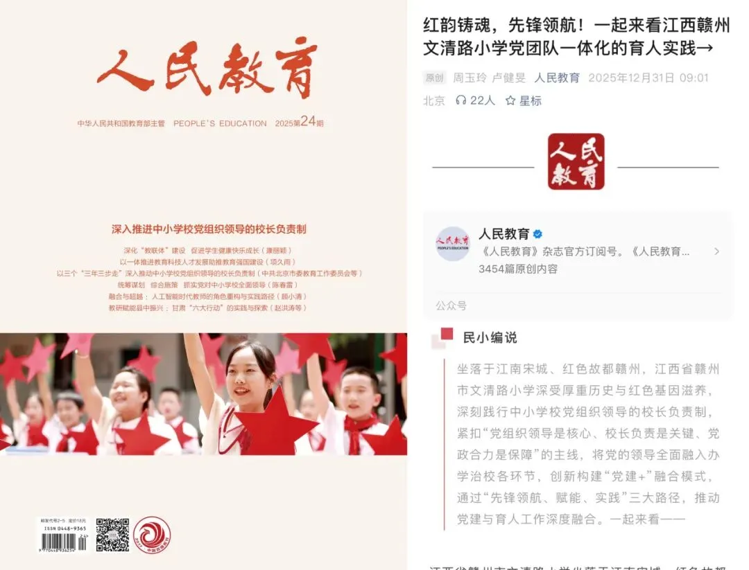 风劲帆满图新志,砥砺奋进正当时。2025年,赣州市文清路小学党委在区委教体工委的坚强领导下,坚持以高质量党建为引领,紧紧锚定“书记领航”这一关键引擎,聚焦育人实践中的“薄弱环节”与“质量高地”双向发力,以“攻薄促弱”的决心和“提质增效”的智慧,推动党建工作与教育教学深度融合,学校党建文章《红韵铸魂 先锋领航——江西省赣州市文清路小学党团队一体化育人实践》发表在《人民教育》杂志,为办好人民满意的教育注入强劲动能。