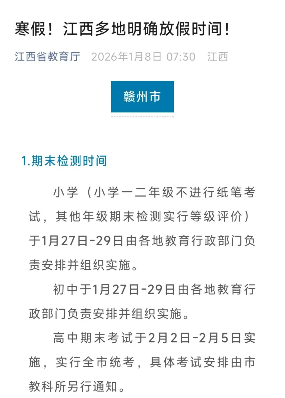 期末考试来了!近日,赣州公布期末考试时间,因今年过年时间较晚,所以整体期末和寒假安排较去年都有推迟。今年,赣州初中期末考试时间为1月27日-1月29日,具体安排如下↓