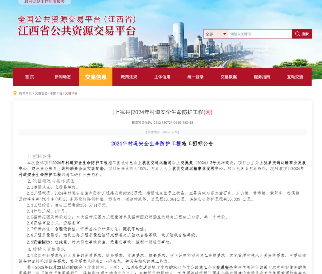 2024年村道安全生命防护工程发布施工招标,工程投资:建安工程费约354.5744万元,主要实施内容为油石乡、东山镇、黄埠镇、紫阳乡、社溪镇、五指峰乡共计6个乡(镇)23 条路段的路侧护栏、标志牌、减速标线等,总里程43.364公里,实施安全防护里程共36.339 公里。计划工期4个月。此举将有效提升农村公路安全水平,筑牢群众出行“生命防线”。来源:江西公共资源交易网