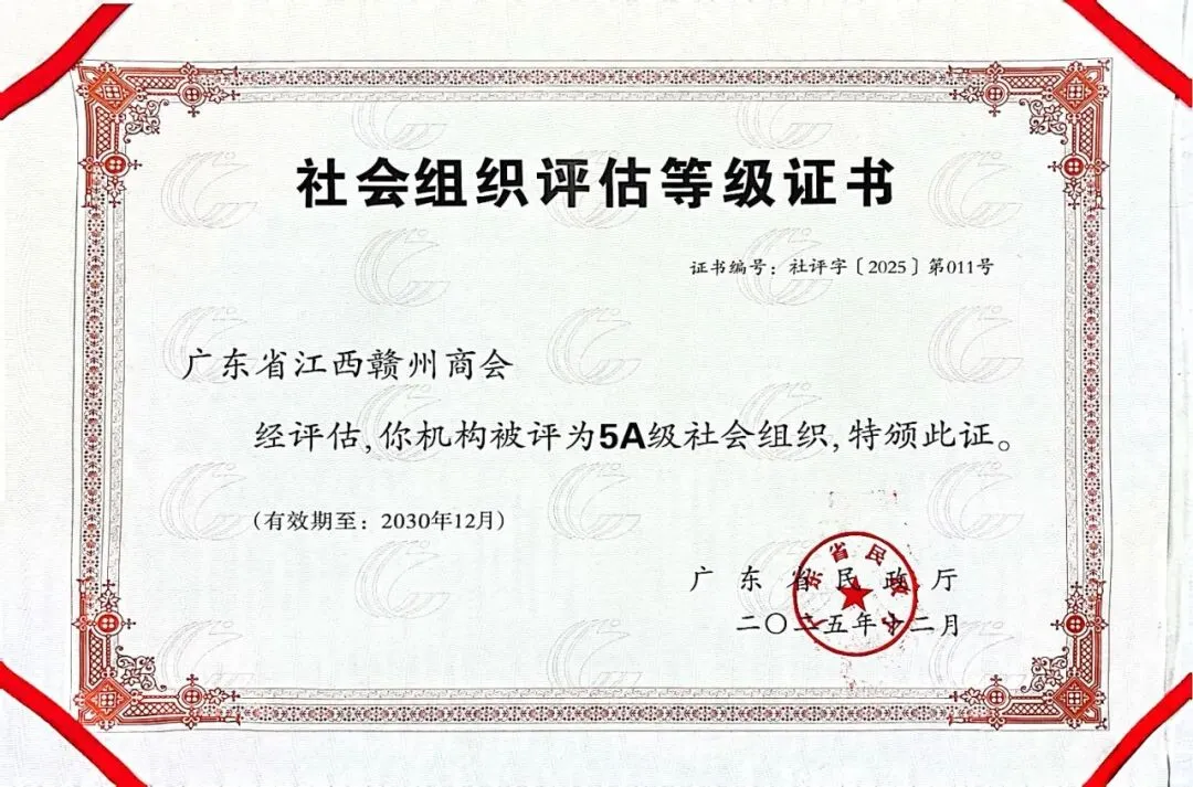 广东省赣州商会荣获广东省5A级全省性社会团体称号,是商会核心领导班子和广大会员共同努力的结果,也得益于粤赣两地政府、社会工作部、广东省民政厅、社会组织管理局等各级政府部门领导的长期关怀与指导,以及社会各界的信任与支持。此项荣誉既是对商会过往工作的认可,更是对未来发展的鞭策与期待。站在新起点,商会将紧紧围绕高质量发展要求,不忘初心、牢记使命,砥砺前行,继续发挥桥梁纽带作用,不断提升服务水平,积极引导会员企业融入粤港澳大湾区建设,为促进粤赣两地经济文化交流合作,服务国家发展大局贡献更大力量!