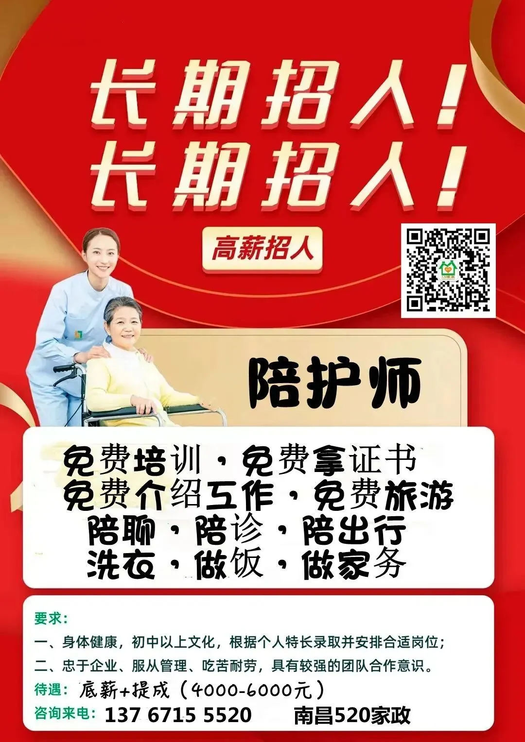 女性,35岁以下,有护士证,大专学历即可,电话:15070049001