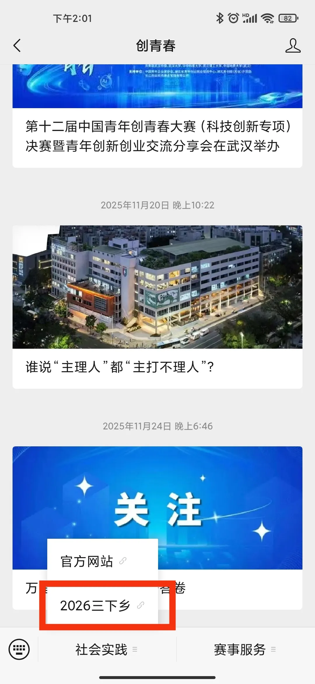 2.进入公众号,点击社会实践后进入“2026三下乡”