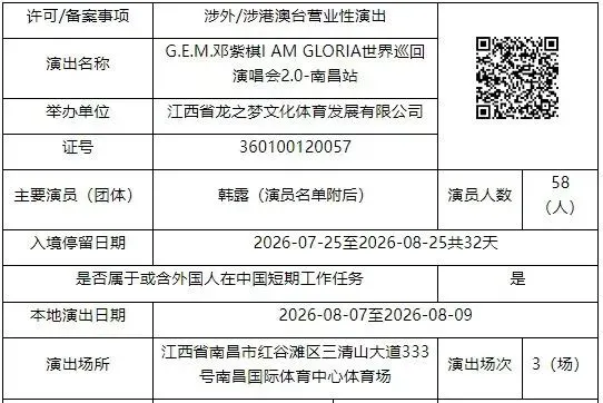 2026年8月7日,8日,9日 — 邓紫棋 — 南昌演唱会。
