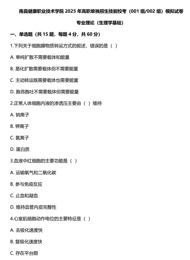 南昌健康职业技术学院2026年高职单招技能校考(001组002组)模拟试卷及答案