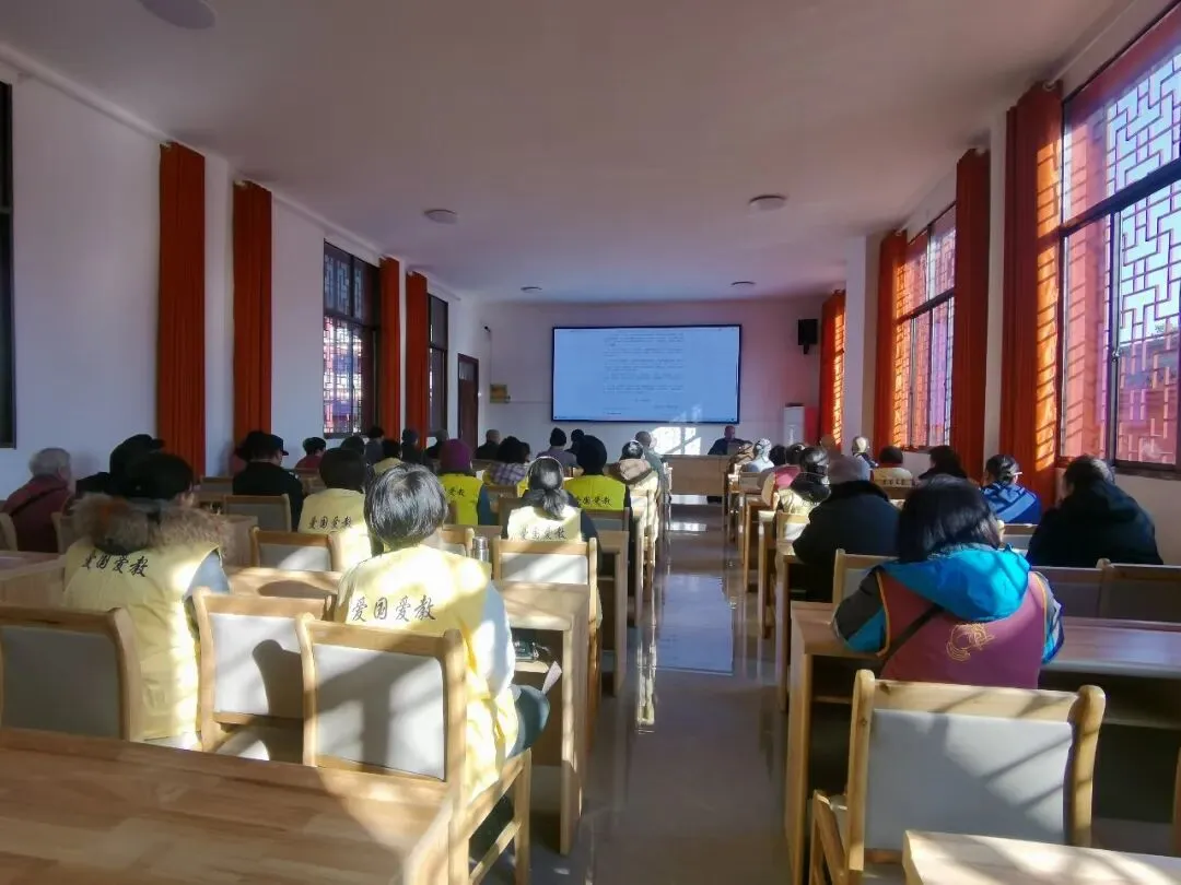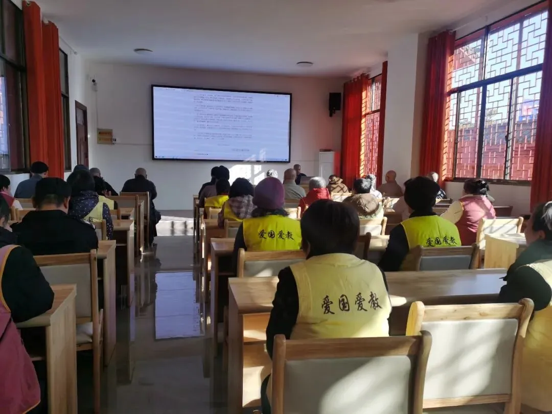 解读过程中,净悟法师重点阐释了“拥党爱国,守法遵规”的核心要义,引导全体参会人员深刻认识到,国法是修行的底线,戒律是道业的根本,唯有将法律法规与教规戒律有机结合,才能真正践行我国佛教中国化方向。针对僧众群体,强调要坚守“以戒为师”的祖训,在共住生活中相互包容、相互砥砺,以清净僧团形象引领正信风尚;针对义工居士代表,则围绕“恭敬三宝、护持道场、敦伦尽分”等守则要求,倡导大家在日常护持中规范言行、端正心念,将信仰力量转化为服务社会的实际行动。