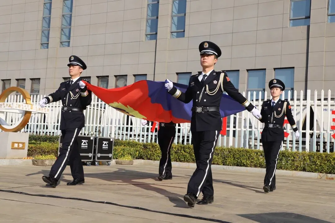 仪式现场气氛隆重肃穆,冬日阳光下,仪仗队员迈着铿锵有力的步伐,护卫着鲜艳的五星红旗行进到升旗台前。伴随着《义勇军进行曲》振奋激昂的旋律响起,国旗冉冉升起、迎风飘扬,参加仪式的全体民警身着警礼服,警容严整、昂首挺胸,向国旗庄严敬礼。