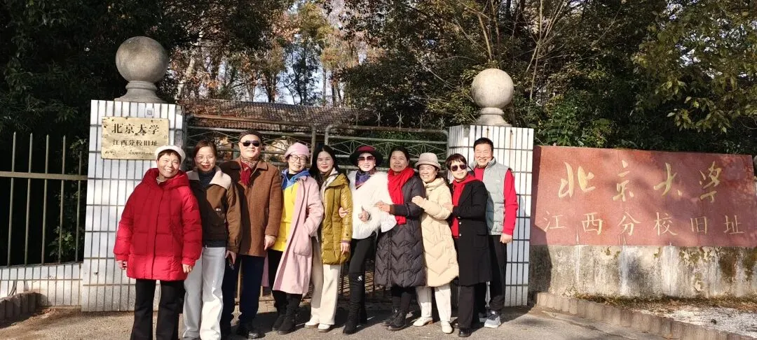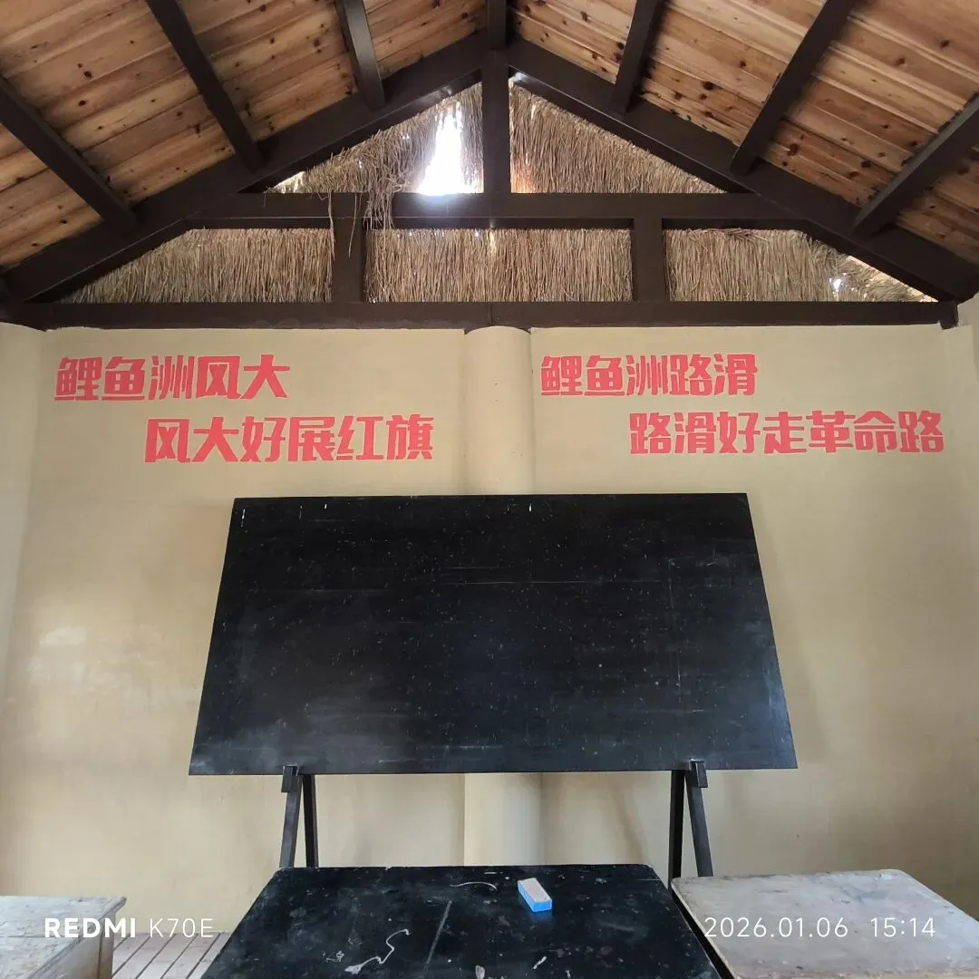 北大分校也没开门,一样的铁栅栏门,好处是可以透过栅栏看到里面的校舍,一样的红砖红瓦,墙上用石灰水刷着“团结紧张严肃活泼”八个大字,我记得读初中的时候,学校墙上也是这八个字,也许全国的学校都是这样吧?旧址两边建有校友之家和盖着茅草顶的教室,教室里的那两句话大家都背下来了:“鲤鱼洲风大,风大好展红旗;鲤鱼洲路滑,路滑好走革命路”,那是激情燃烧气势如虹的年代,那时的年轻人不怕苦不怕累思想进步集体观念强,在这里上班不仅风大路滑,还有罹患血吸虫病的风险。我们这帮退休人员都多少了解六七十年代那段历史,坐在教室里也是颇有感触。大家即兴跳一段北京的金山上来致敬吧!