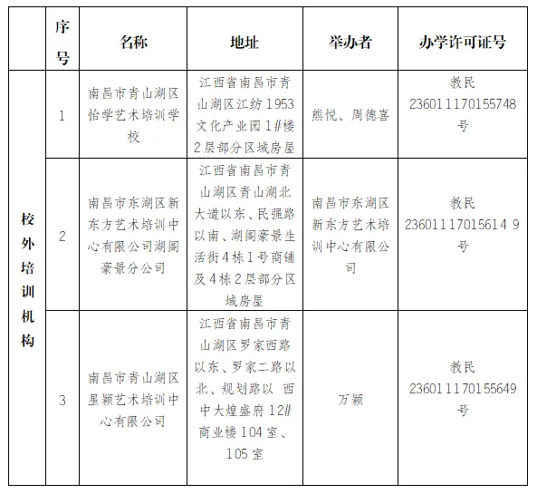 根据《中华人民共和国民办教育促进法》及其实施条例和《江西省民办教育促进条例》相关政策以及《中华人民共和国行政许可法》第七十条之规定,经机构法人申请,现将2025年第二批南昌市青山湖区新设立的校外培训机构进行通告。