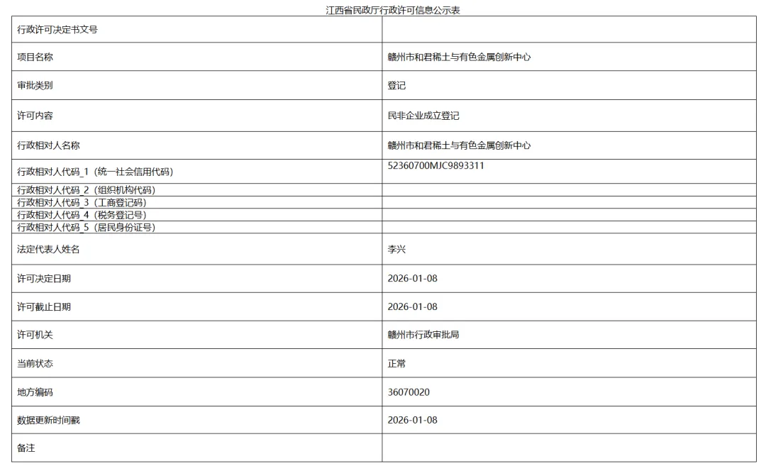 赣州市和君稀土与有色金属创新中心完成民非企业成立登记。