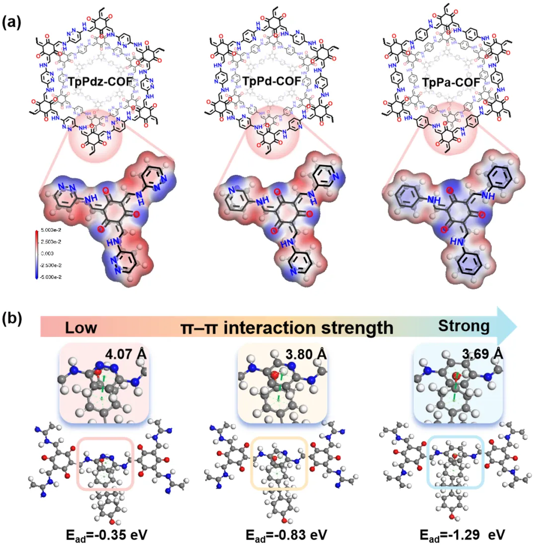 图 1 (a) TpPdz-COF、TpPd-COF 和TpPa-COF 的静电势(ESP)分布。(b) BPA 在不同连接体结构的 COFs 上的优化吸附构型。
