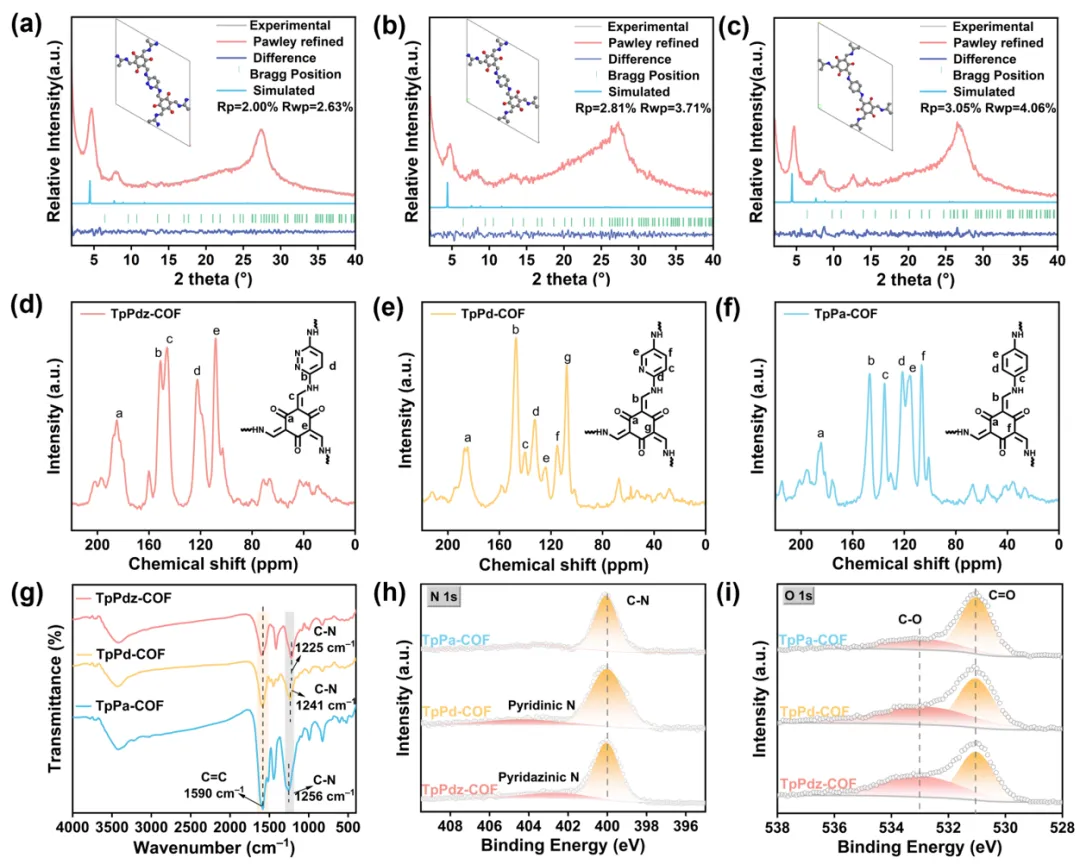 图 2 (a) TpPdz-COF、(b) TpPd-COF 和 (c) TpPa-COF 的实验 PXRD、模拟 PXRD 及 Pawley 精修数据(AA堆叠方式)。(d) TpPdz-COF、(e) TpPd-COF 和 (f) TpPa-COF 的 13C CP/MAS NMR 光谱。(g) 不同 COFs 的 FT-IR 光谱。(h)不同 COFs 的高分辨 N 1s XPS 光谱。(i) 不同 COFs 的高分辨 O 1s XPS 光谱。