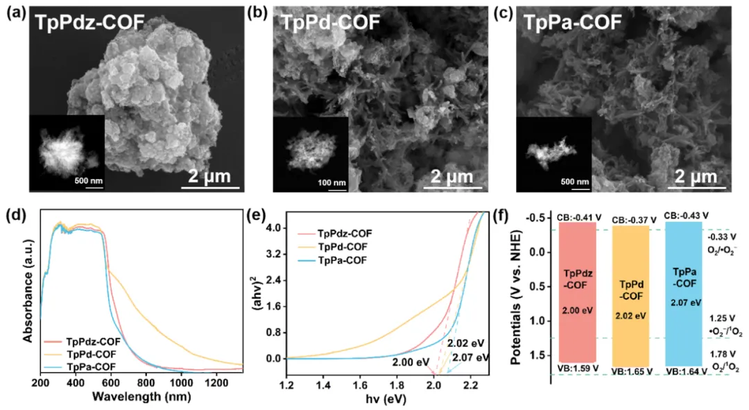 图 3 (a) TpPdz-COF、(b) TpPd-COF 和 (c) TpPa-COF 的 SEM 与 TEM 图像。(d–e) COFs 的 UV–vis DRS 光谱及对应的Tauc 图。(f) COFs 的能带结构示意图。