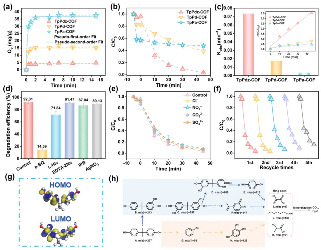 图 4 (a) BPA 在不同 COFs 上的吸附动力学及其拟合的准一级和准二级动力学模型。(b) 不同 COFs 在光照条件下对BPA 降解的动力学速率常数。(c) BPA 光降解的伪一级动力学拟合以及不同 COFs 对应的 Kobs值。(d) 不同活性物种淬灭剂存在时 TpPdz-COF 对 BPA 的光降解效率。(e) 共存阴离子存在时 TpPdz-COF 的 BPA 光降解性能。(f) TpPdz-COF 在可见光照射下的循环使用性能。(g) BPA 的 HOMO 与 LUMO 分布。(h) BPA 光催化降解途径。