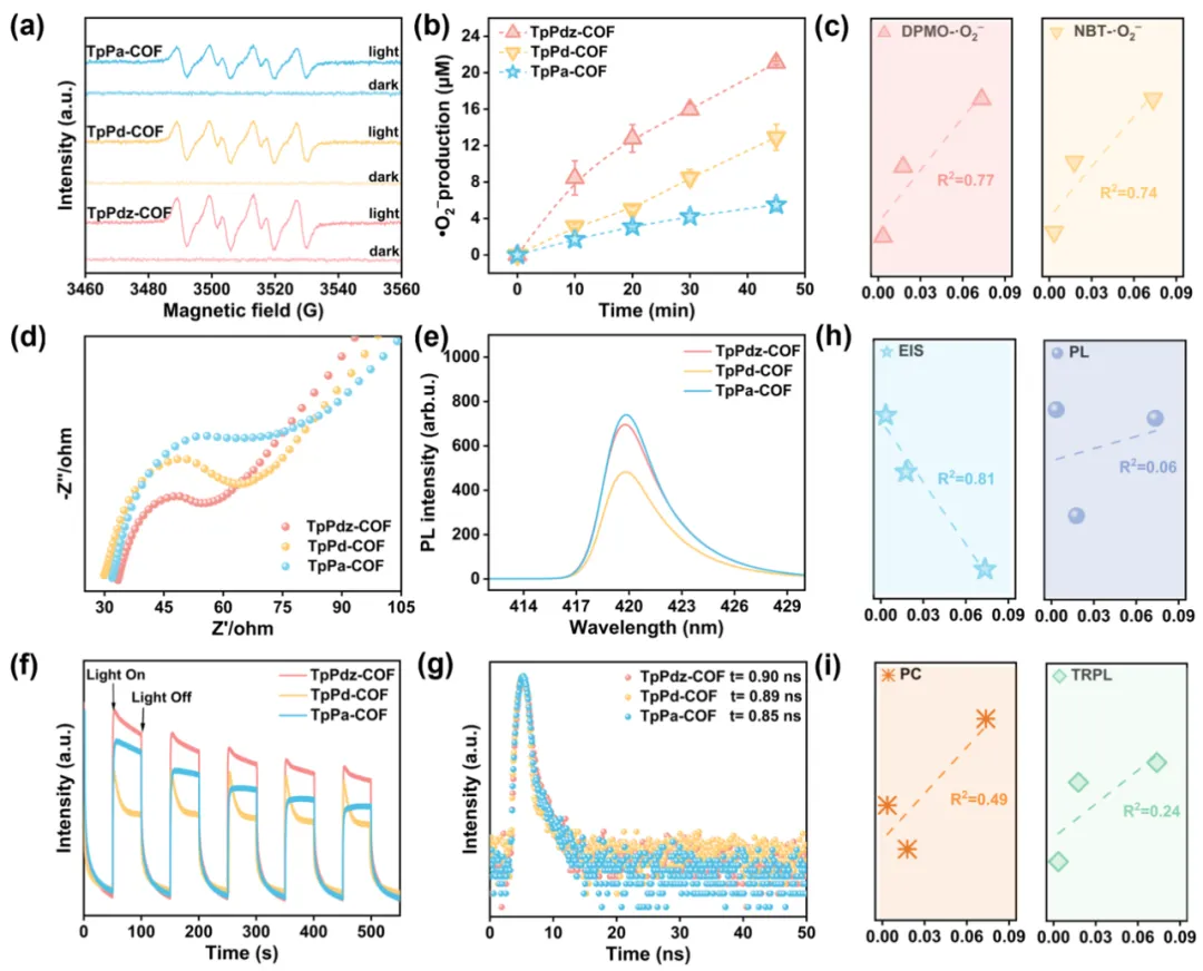 图 5 (a) DMPO-•O2–的 EPR 信号。(b) 采用 NBT 法检测的 •O2– 生成量随时间的变化。(c) •O2–的半定量分析及其与 kobs的相关性。(d) COFs 的 EIS 光谱。(e) COFs 的 PL 光谱。(f) COFs 的 PC光谱。(g) COFs 的 TRPL 光谱。(h–i) 四类光化学表征的半定量结果及其与 kobs的相关性分析。