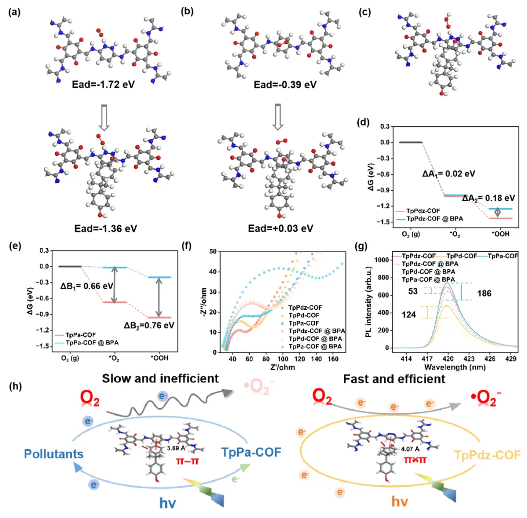 图 6 (a–b) TpPdz-COF 和 TpPa-COF 在吸附 BPA 前后对 O2的吸附能及其结构。(c) 在 BPA 吸附条件下,TpPdz-COF 上用于 O2活化的推测反应位点。(d) TpPdz-COF 在吸附 BPA 前后,O2活化过程中 *OOH 生成的吉布斯自由能变化曲线。(e) TpPa-COF 在吸附 BPA 前后,O2活化过程中 *OOH 生成的吉布斯自由能变化曲线。(f–g) COFs 在吸附 BPA 前后的EIS 与 PL 光谱。(h) π–π 相互作用调控界面吸附及 BPA 降解的机理示意图。
