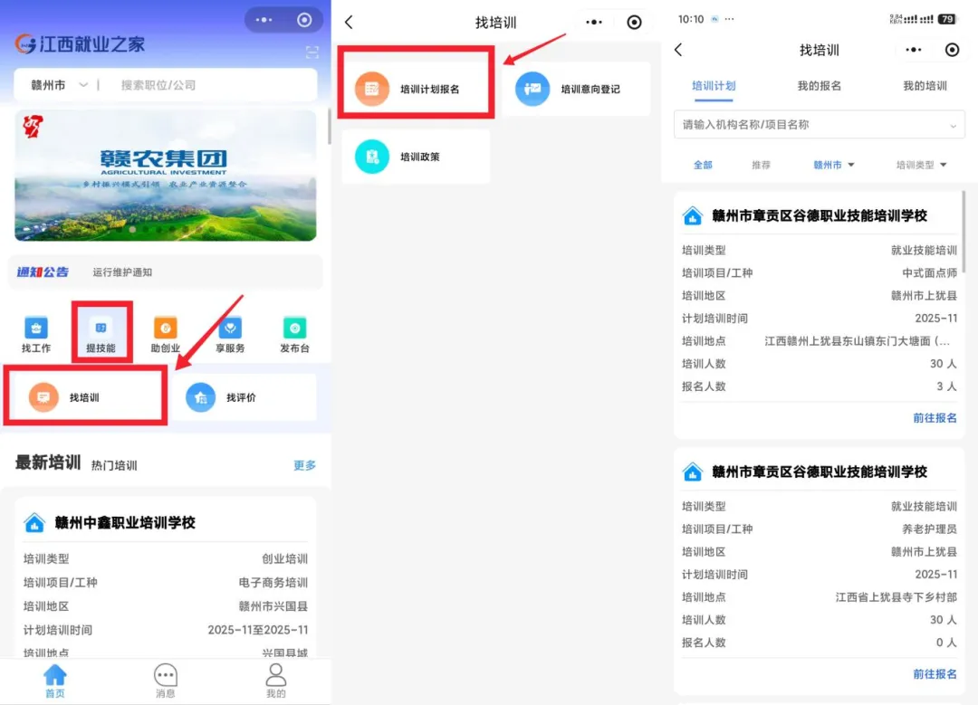 大家可在微信应用中搜索“江西就业之家”微信小程序,点击“提技能”板块,继续点击“找培训——培训计划报名”,地区选择“赣州市”,查询现在正在招募学员的培训班级,根据自己培训需求,点击“前往报名”完成线上报名。(名额有限,先到先得)