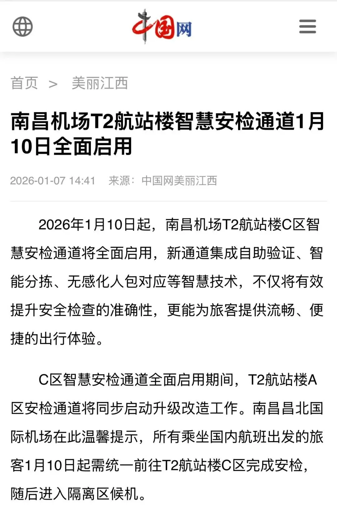 1月7日,中国网发布《南昌机场T2航站楼智慧安检通道1月10日全面启用》资讯。