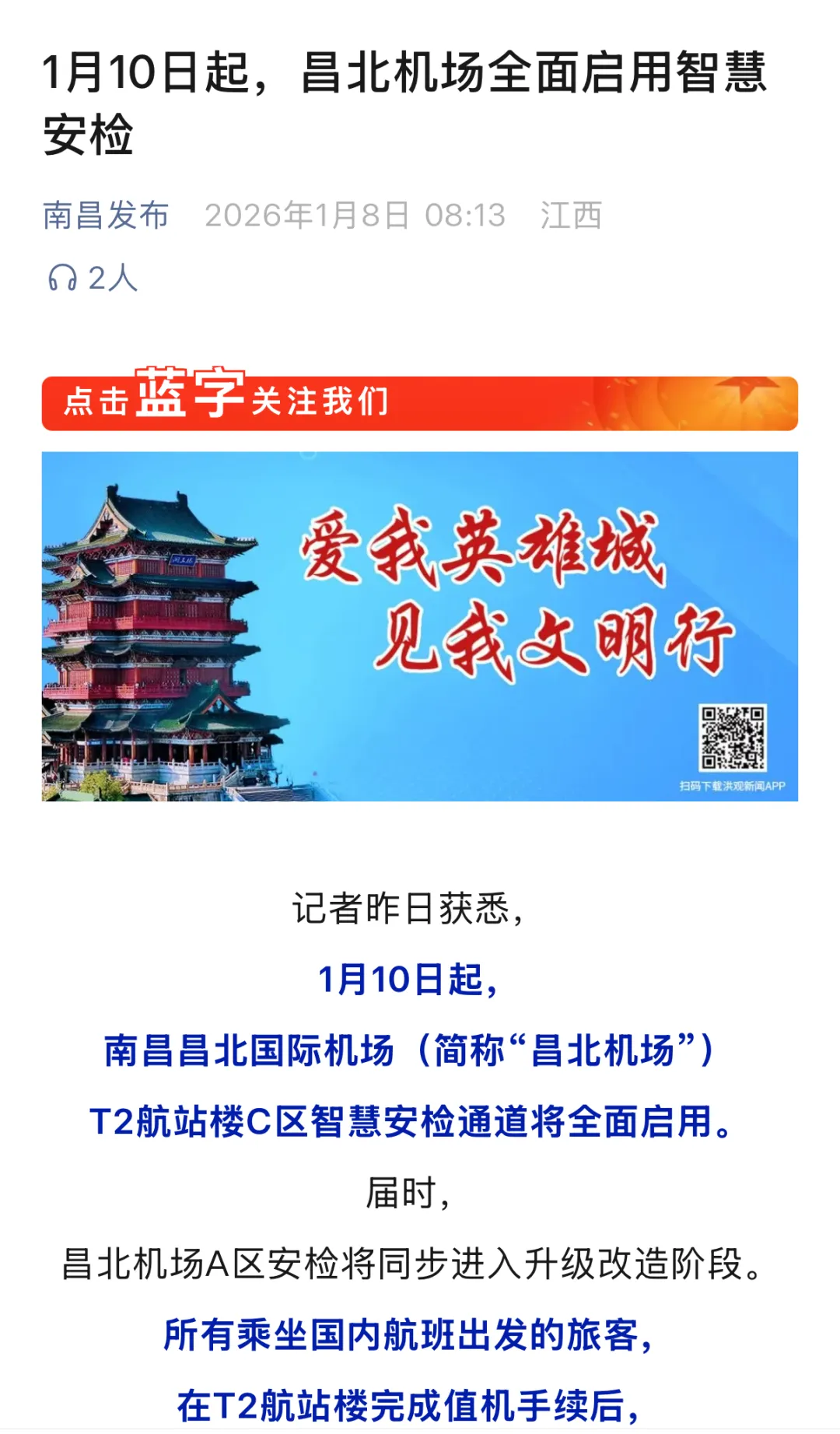 1月8日,江西交通广播报道南昌机场T2航站楼全面启用智慧安检相关资讯。