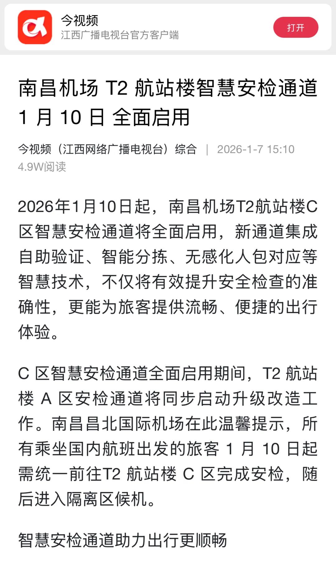 1月7日,今视频客户端发布《南昌机场t2航站楼智慧安检通道1月10日全面启用》资讯。